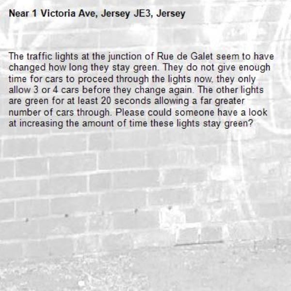 The traffic lights at the junction of Rue de Galet seem to have changed how long they stay green. They do not give enough time for cars to proceed through the lights now, they only allow 3 or 4 cars before they change again. The other lights are green for at least 20 seconds allowing a far greater number of cars through. Please could someone have a look at increasing the amount of time these lights stay green?
