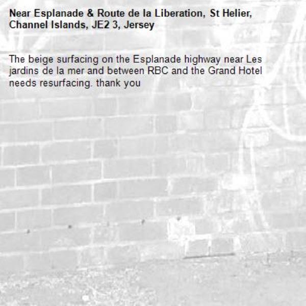 The beige surfacing on the Esplanade highway near Les jardins de la mer and between RBC and the Grand Hotel needs resurfacing. thank you<br/>