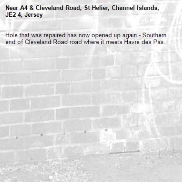 Hole that was repaired has now opened up again - Southern end of Cleveland Road road where it meets Havre des Pas.