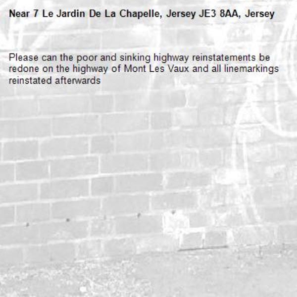 Please can the poor and sinking highway reinstatements be redone on the highway of Mont Les Vaux and all linemarkings reinstated afterwards