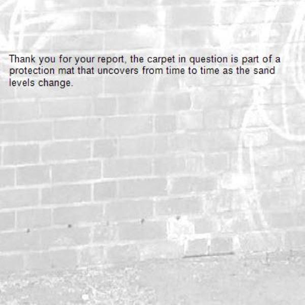 Semi submerged carpet or similar. Significant size. Been on beach most of summer. 2 seperate areas. Approx 50m from sea wall