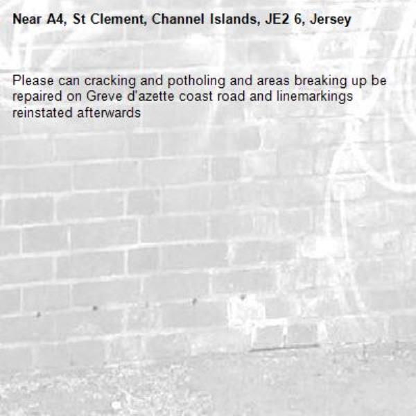 Please can cracking and potholing and areas breaking up be repaired on Greve d'azette coast road and linemarkings reinstated afterwards