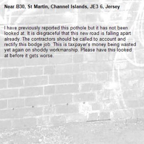 I have previously reported this pothole but it has not been looked at. It is disgraceful that this new road is falling apart already. The contractors should be called to account and rectify this bodge job. This is taxpayer's money being wasted yet again on shoddy workmanship. Please have this looked at before it gets worse.